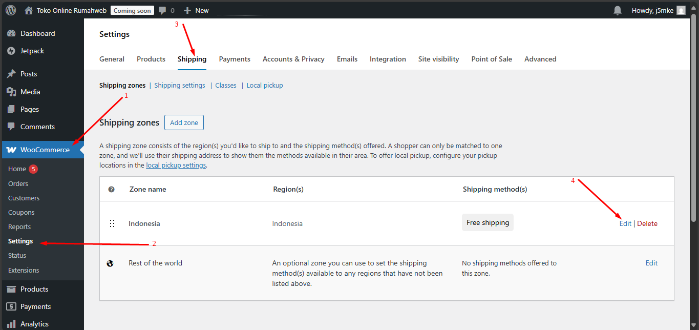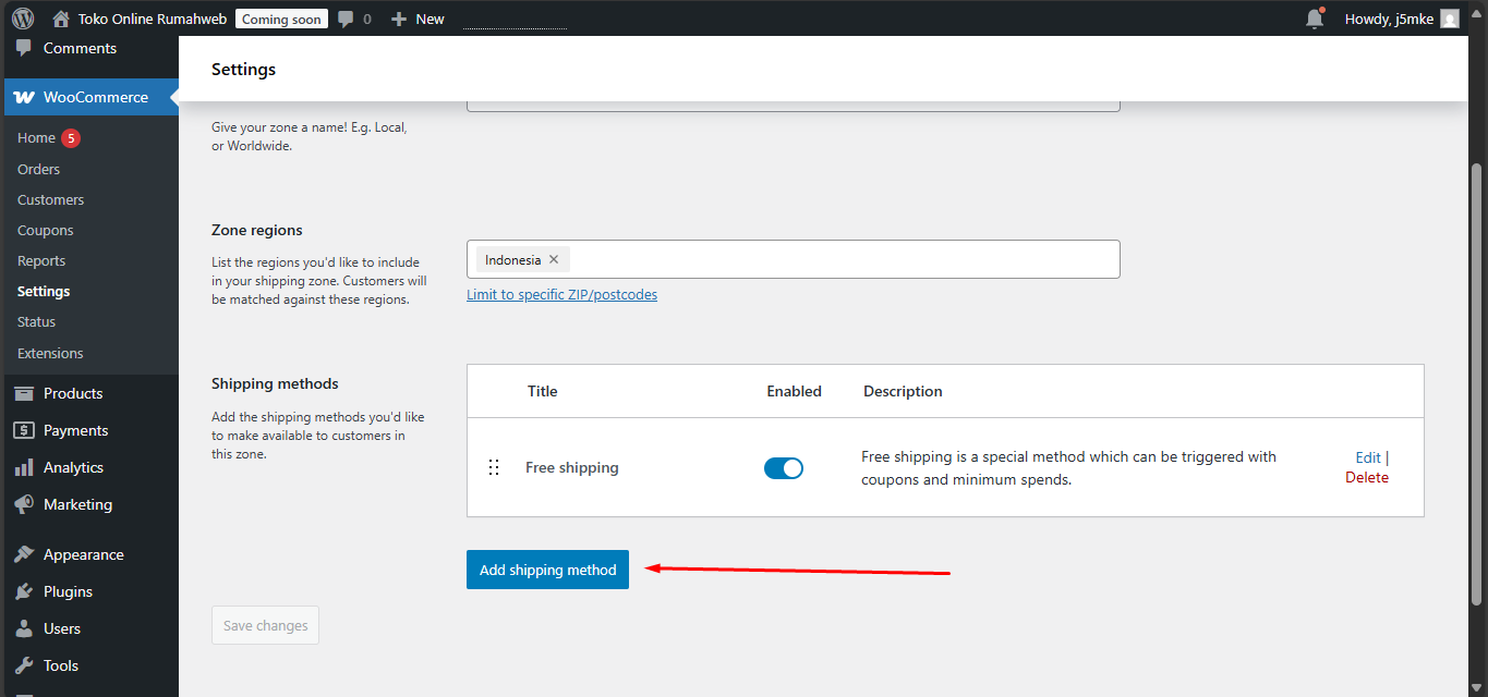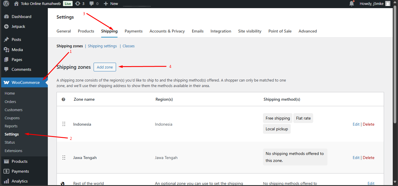 Untuk dapat mengatur metode pengiriman, masuk pada menu WooCommerce, klik ‘Settings’ > kemudian cari menu ‘Shipping’, lalu klik ‘Edit’ pada zona yang sudah ada.