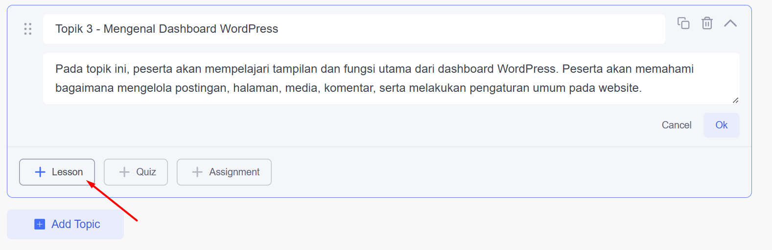 - Untuk menambahkan pelajaran baru, klik tombol “+ Lesson” di dalam salah satu topik.