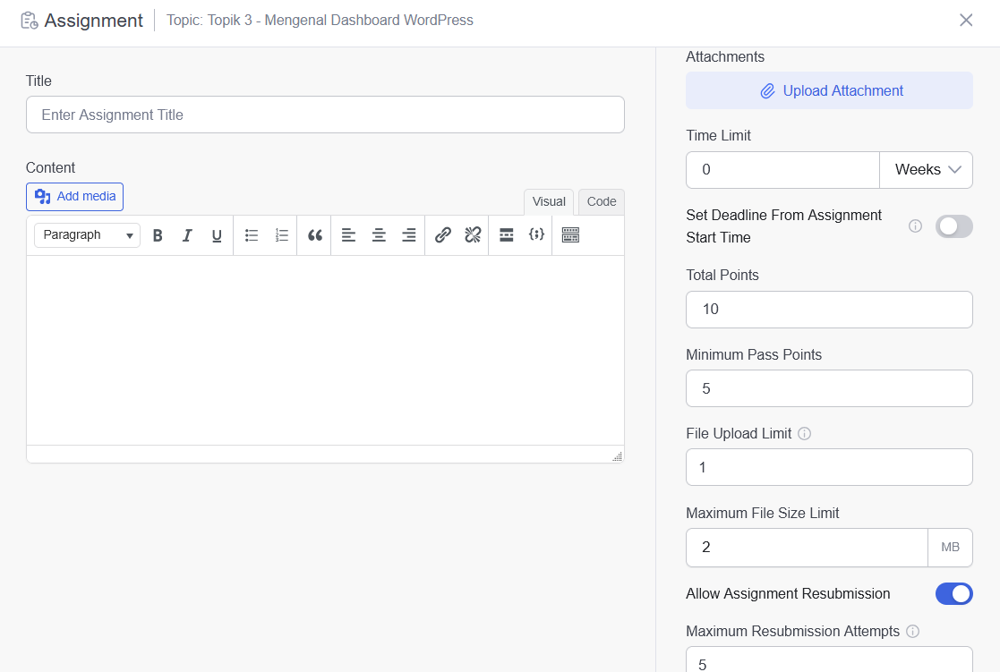 - Tambahkan penjelasan singkat di bagian Content untuk memberikan instruksi, tujuan, serta panduan pengerjaan tugas.