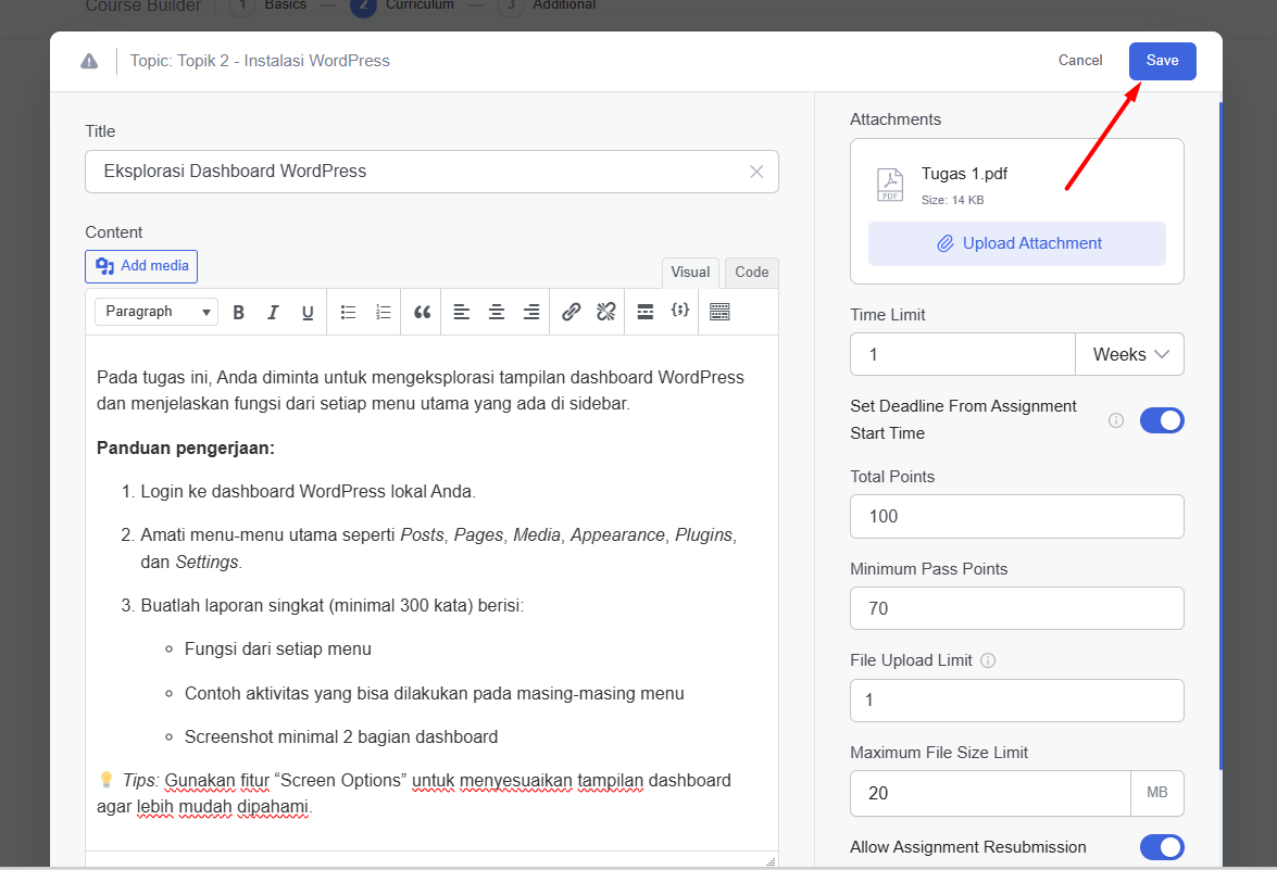 - Setelah semua pengaturan selesai, klik “Save” untuk menyimpan tugas Anda ke dalam kursus.