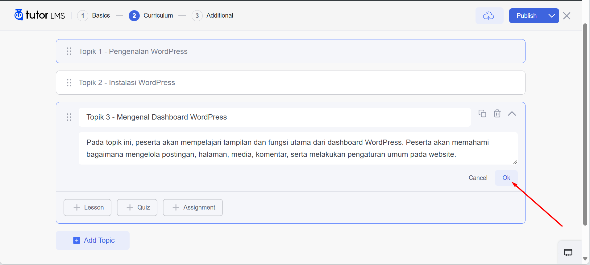 Topik berfungsi sebagai “wadah” untuk mengelompokkan pelajaran dan kuis yang saling berhubungan. Bisa dibilang, topik ini seperti bab atau modul dalam sebuah buku. Dengan adanya topik, kursus Anda jadi lebih rapi dan enak diikuti.