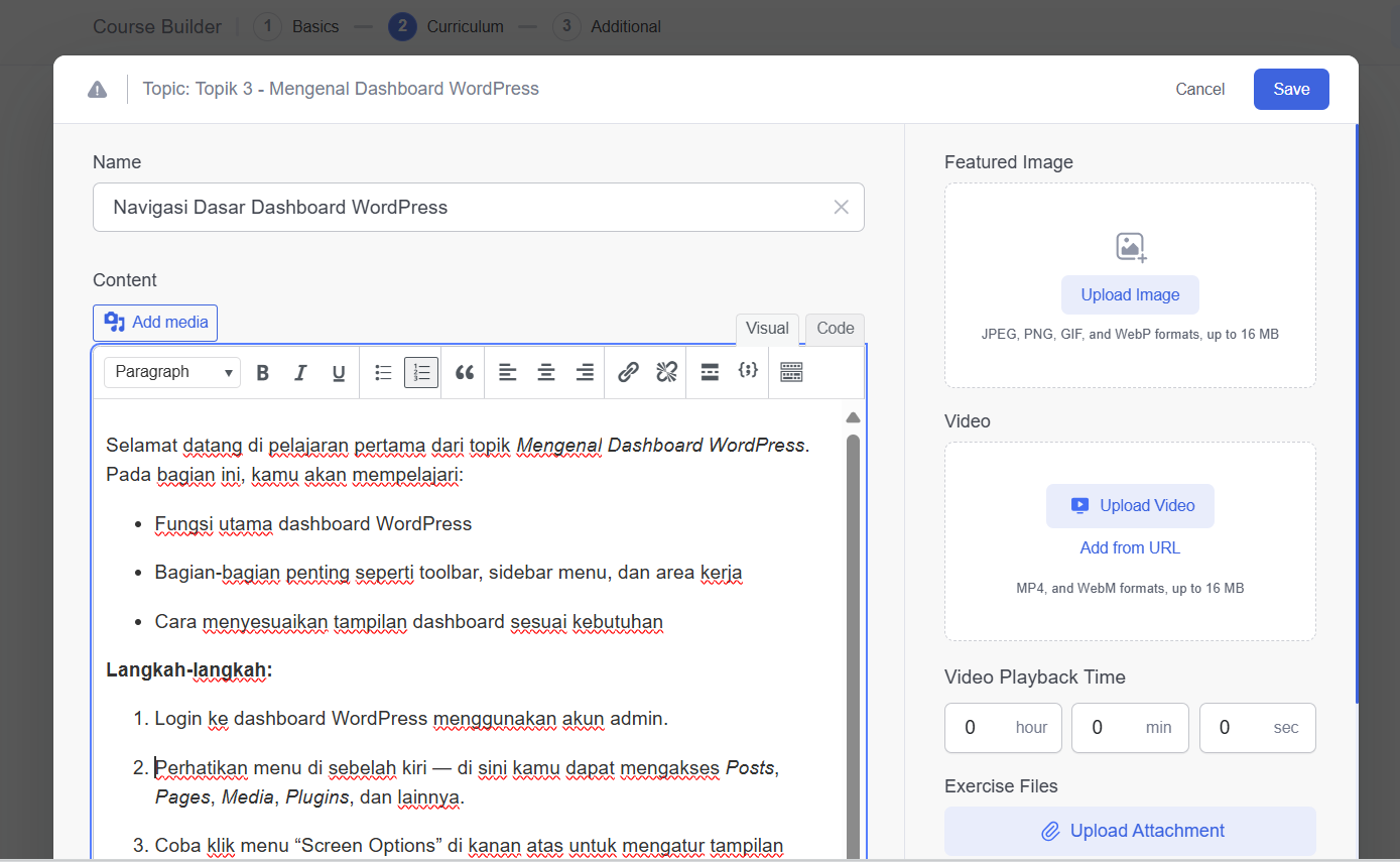 Bagian “Exercise Files” memungkinkan Anda menambahkan bahan pendukung yang bisa diunduh oleh siswa. Anda dapat mengunggah berbagai jenis file seperti PDF, dokumen, audio, video, dan lainnya. Fitur ini sangat berguna untuk memberikan materi tambahan atau latihan yang membantu siswa memahami pelajaran dengan lebih mendalam.