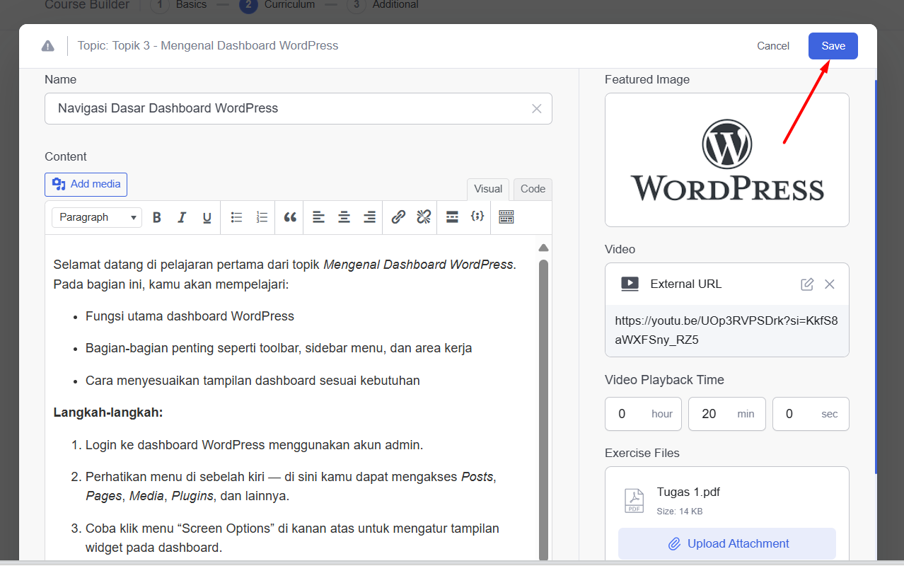 Setelah Anda selesai membuat pelajaran, klik tombol “Save” yang berada di pojok kanan atas Course Builder untuk menyimpan semua perubahan.