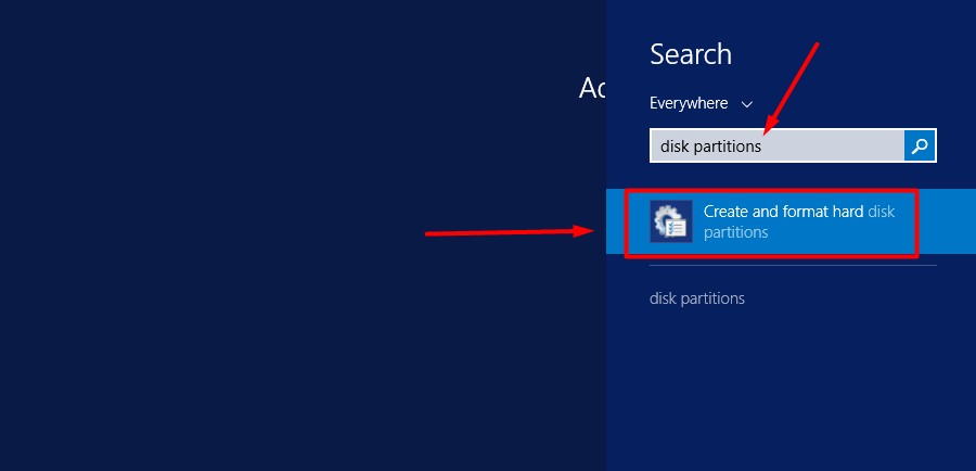 - Pada bagian Search, ketik “disk partitions” dan kemudian klik menu “Create and format hard disk partitions”.