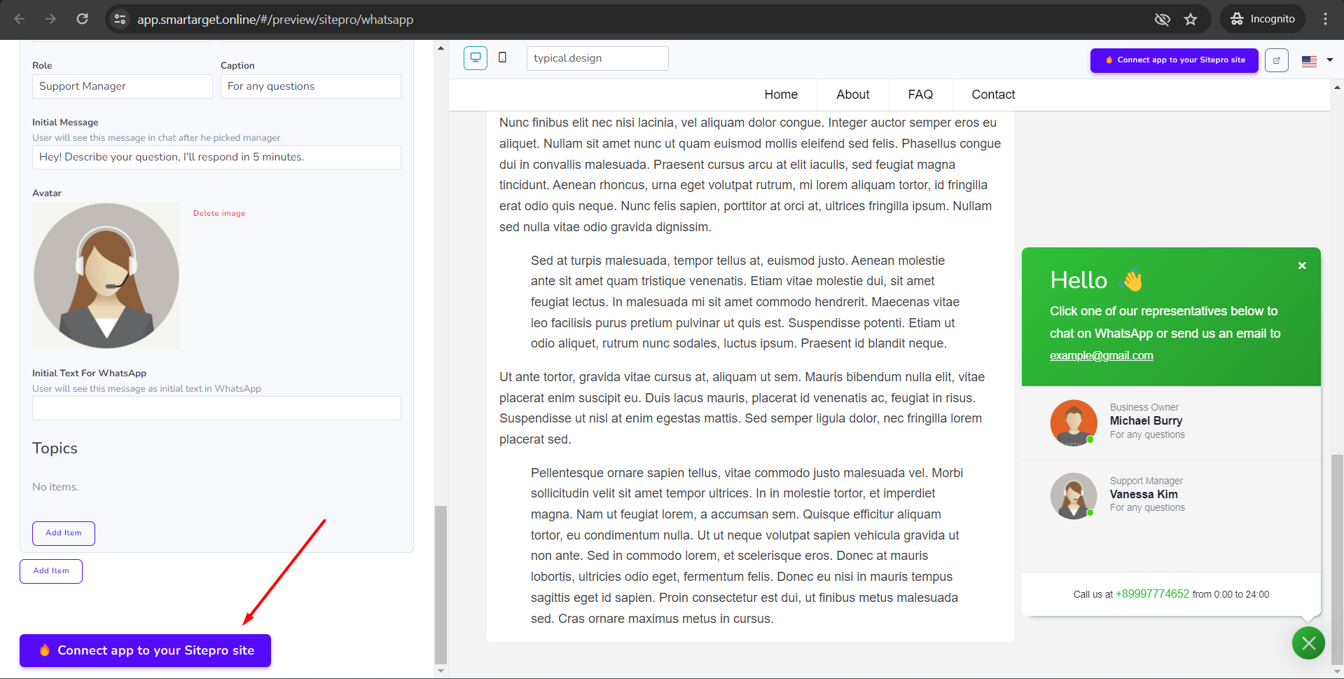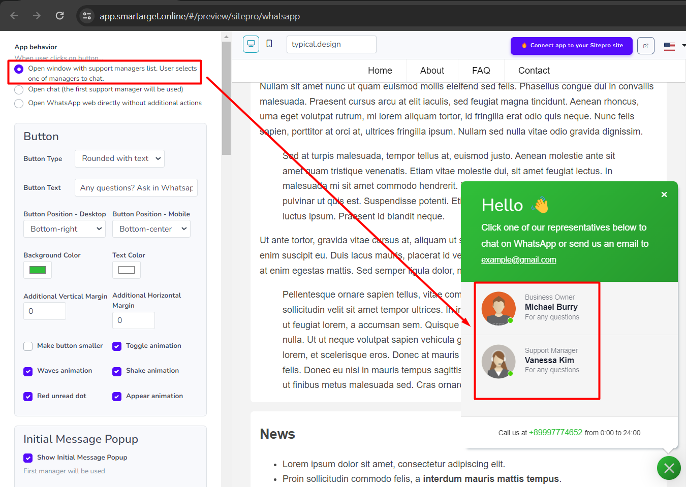- Apabila ingin membuat lebih dari 1 agent WhatsApp, maka klik pada bagian “Open window with support managers list. User selects one of managers to chat.”