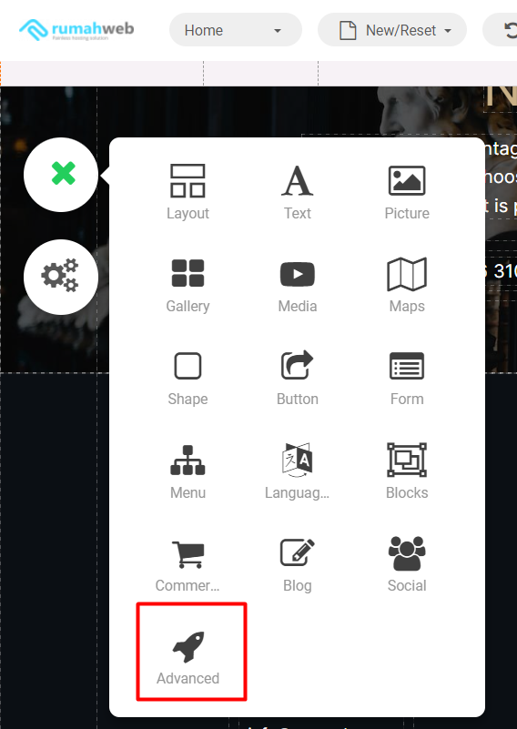 - Setelah masuk ke halaman SitePro editor, silahkan klik tanda + lalu klik bagian advanced.
