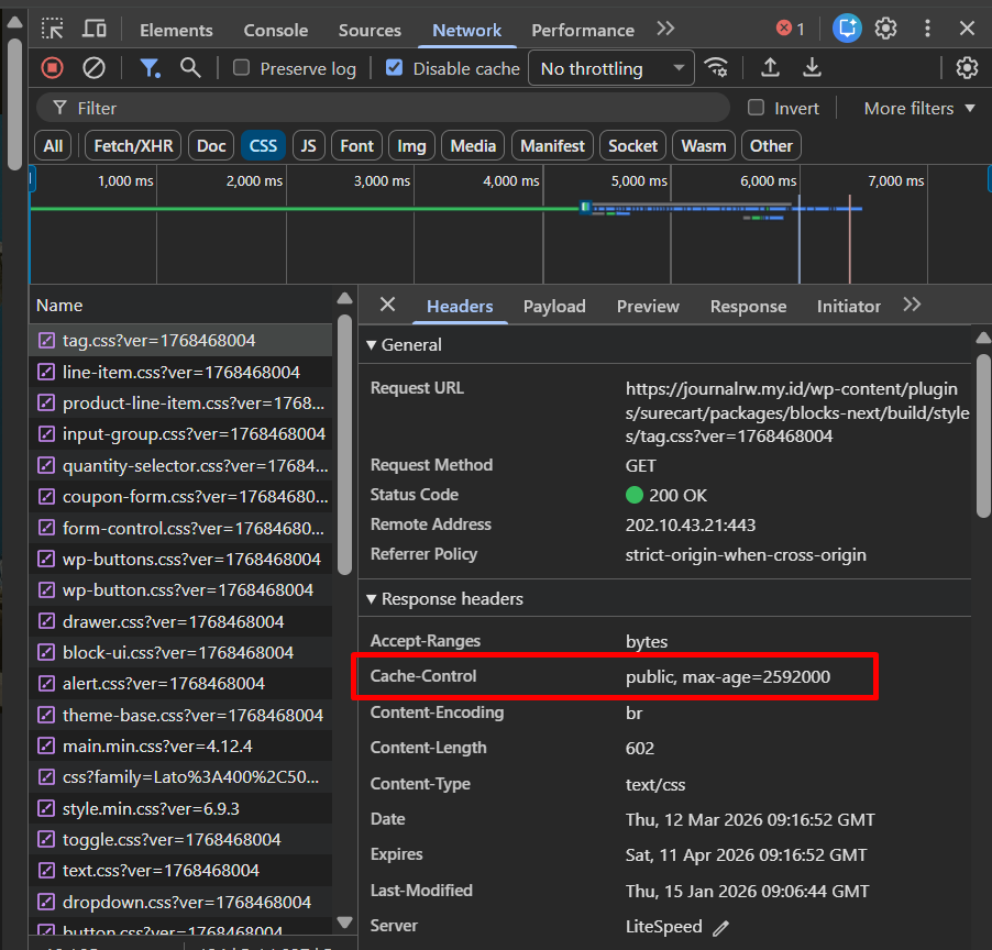 Jika konfigurasi berhasil, Anda akan melihat bagian headers pada bagian Cache-Control