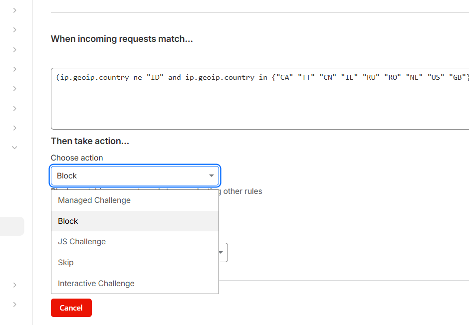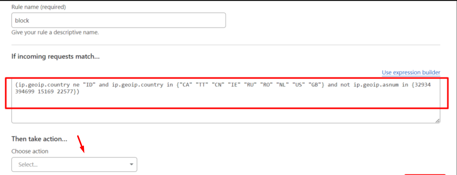 (ip.geoip.country ne "ID" and ip.geoip.country in {"CA" "TT" "CN" "IE" "RU" "RO" "NL" "US" "GB"} and not ip.geoip.asnum in {32934 394699 15169 22577})- Kemudian pilih ‘choose action’ seperti gambar berikut: