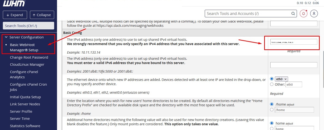 - Scroll ke bawah sampai pada bagian Basic Config, lalu sesuaikan IP server/VPS yang baru di isian “The IPv4 address (only one address) to use to set up shared IPv4 virtual hosts:”