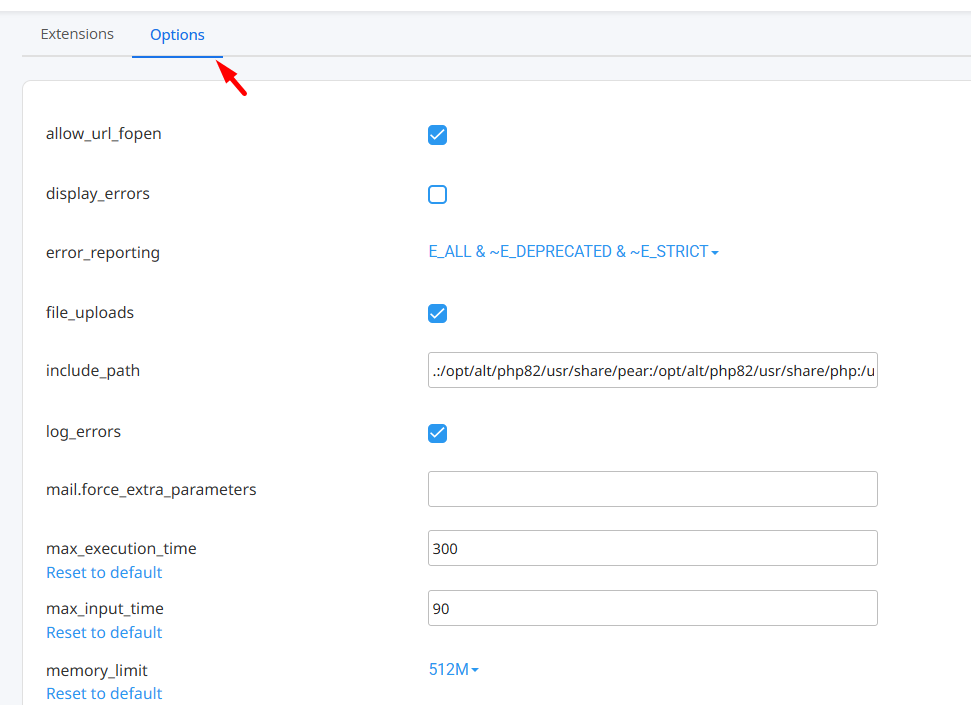 Silahkan klik menu Options, lalu sesuaikan value options php yang Anda inginkan. Untuk penjelasan tentang mengubah nilai php options, kami publikasi secara terpisah melalui artikel berikut: Cara Setting Limit PHP cPanel