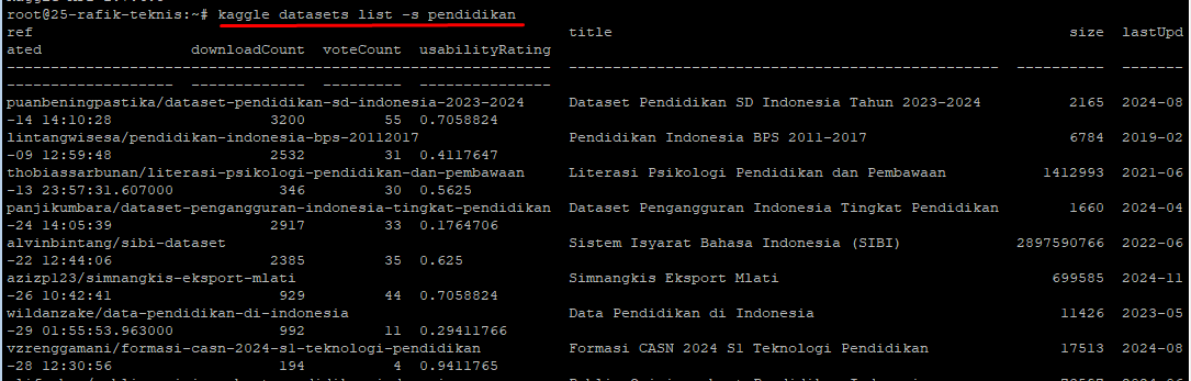 kaggle datasets list -s [nama_topik]Contoh: kaggle datasets list -s pendidikan
