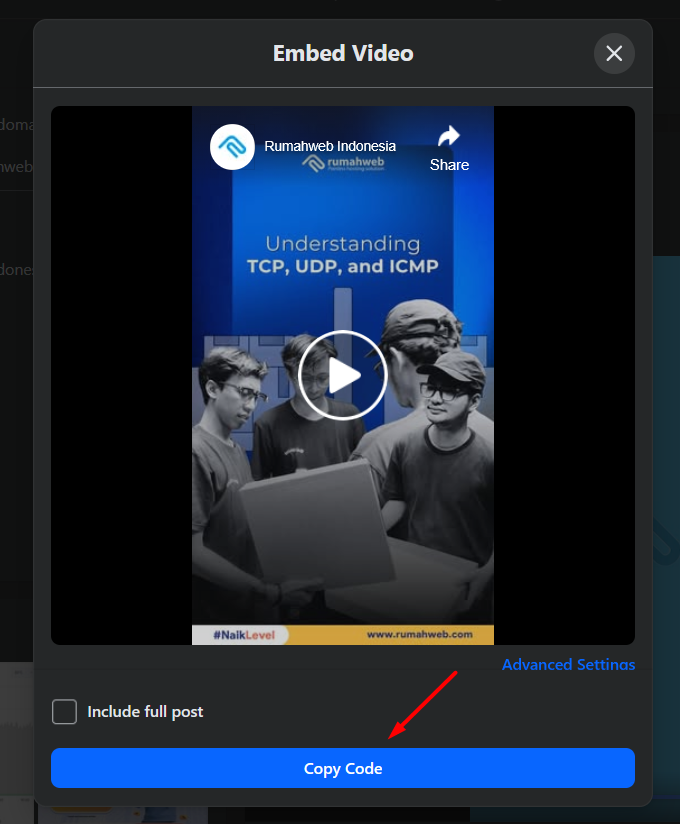 - Kemudian klik copy code. Anda bisa centang Include full post jika memerlukannya.