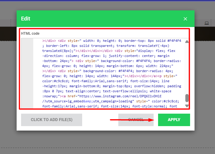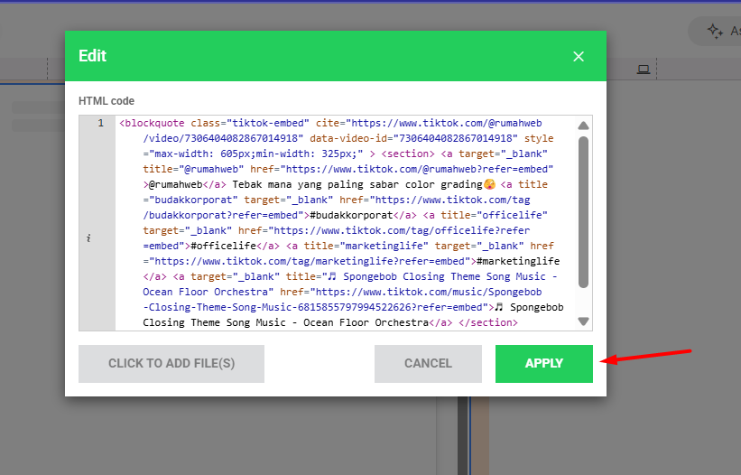 - Memasukkan kodenya ke dalam Custom HTML dan klik Apply.