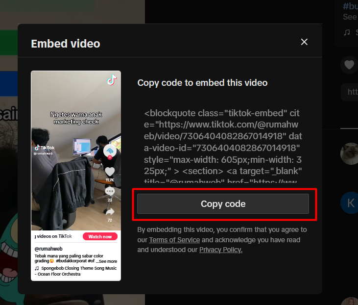 - Kemudian akan tampil block yang berisikan script, klik tombol copy embed code.