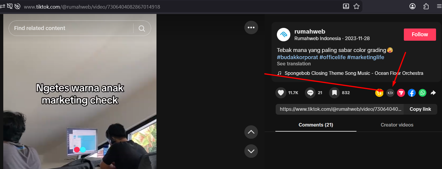 - Pilih video yang akan digunakan, lalu klik icon <> untuk melakukan generate code embednya.