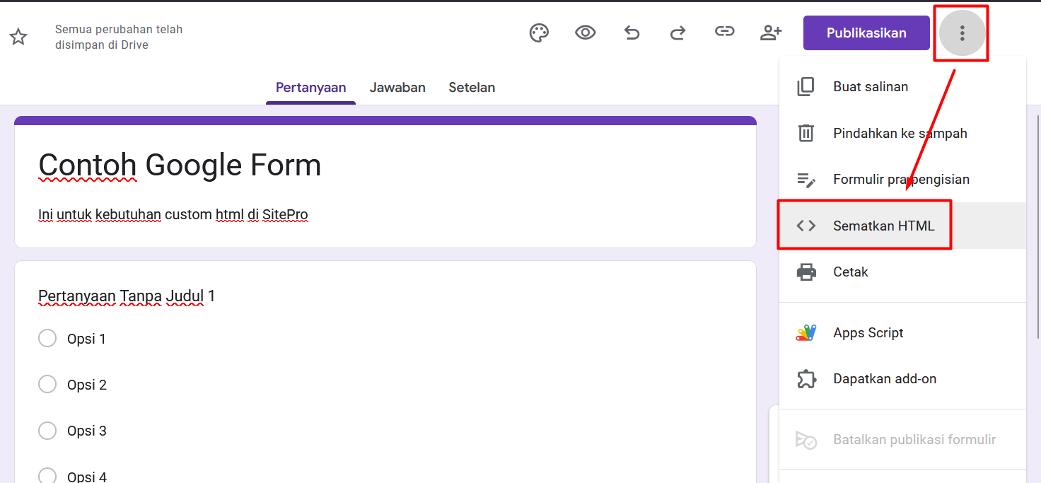- Pastikan sudah menyiapkan Google Form yang ingin digunakan, setelah itu klik titik 3 lalu pilih embed atau sematkan HTML.