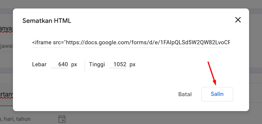 - Anda dapat menyesuaikan ukuran form yang akan ditampilkan. Setelah itu, klik salin/copy untuk mendapatkan script kodenya.