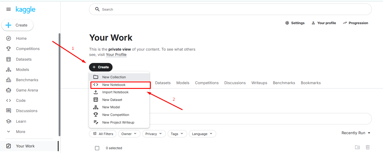 1. Setelah login ke Kaggle, klik menu Notebook di beranda.