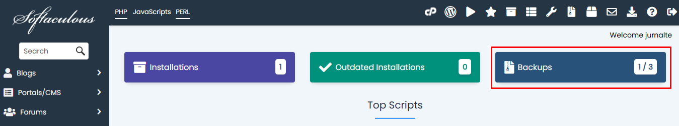 - Setelah masuk ke Softaculous, pilih menu Backups.