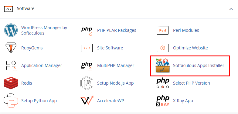 - Cari dan klik menu “Softaculous” atau Softaculous Apps Installer di bagian Software/Services.
