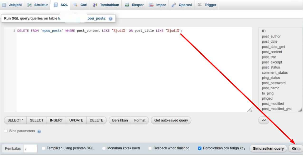 DELETE FROM wp_posts WHERE post_content LIKE '%kata_spam%' OR post_title LIKE '%kata_spam%';Ganti wp_posts dengan nama tabel database Anda dan ganti kata_spam dengan kata atau frasa di postingan SPAM yang ingin anda hapus. Lalu, Klik “Kirim” atau “Go” untuk menjalankan query.