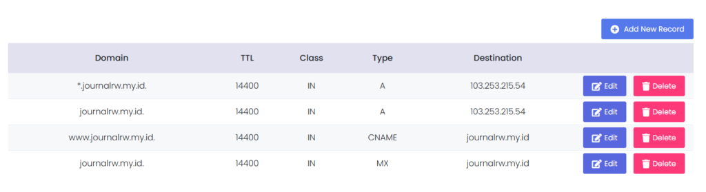 Contohnya, kami akan mengarahkan domain journalrw.my.id ke VPS IP 103.253.215.54. Kami akan membuat beberapa contoh record DNS mulai dari A record, cName, MX hingga Wildcard DNS record.
