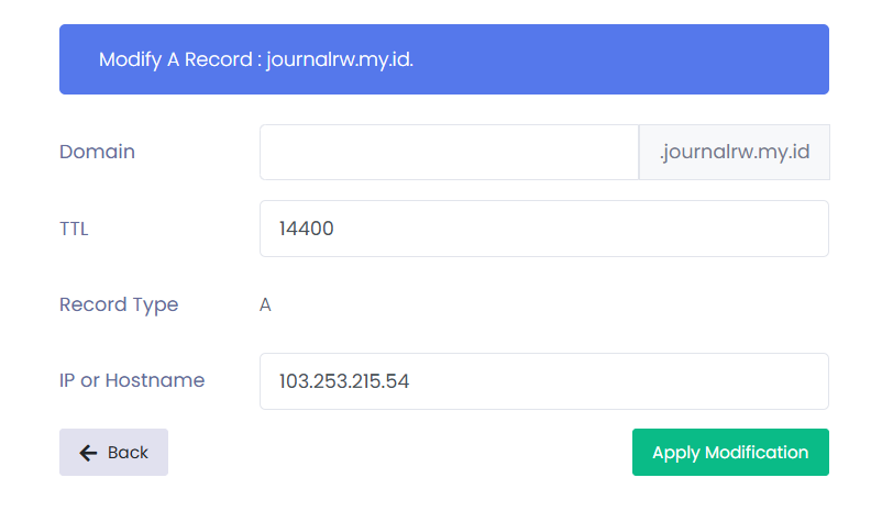 Dengan konfigurasi tersebut, ketika seseorang membuka journalrw.my.id, DNS akan mengarahkan pengunjung ke server VPS dengan IP 103.253.215.54.