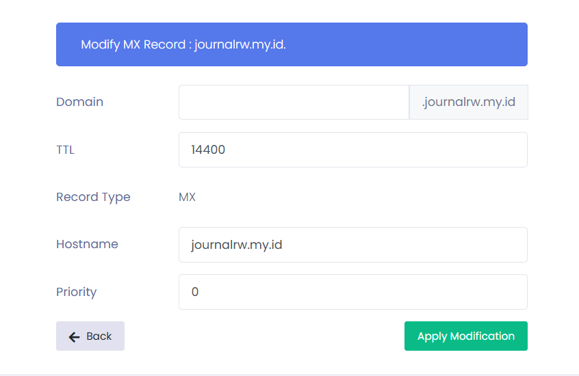 MX record digunakan untuk mengarahkan domain ke Mail server tujuan. Berikut contoh setting MX record ke journalrw.my.id IP 103.253.215.54.