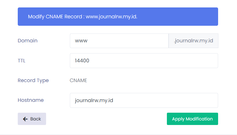 cName record bisa disebut sebagai Aliases record, biasanya menggunakan www. Berikut contoh cara membuat cName record www.journalrw.my.id.