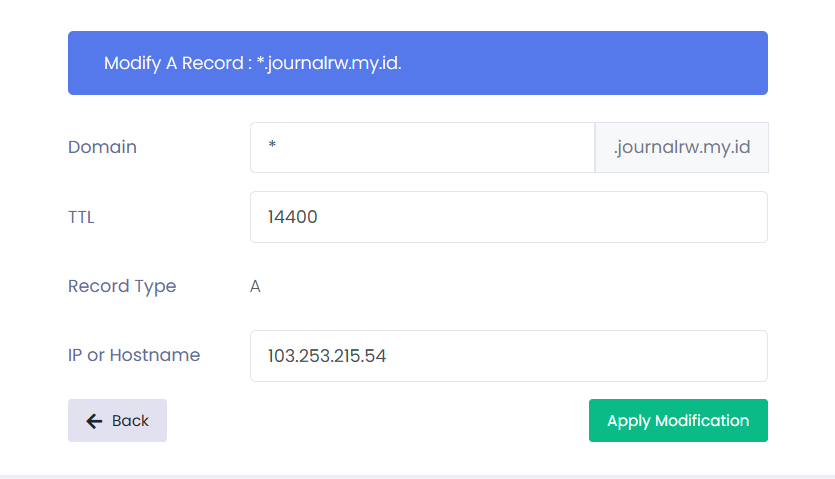 *. artinya adalah Wildcard, yang memiliki fungsi mengarahkan semua record subdomain ke IP tujuan. Berikut contoh membuat recursive A record *.journalrw.my.id ke IP 103.253.215.54.