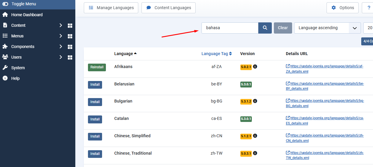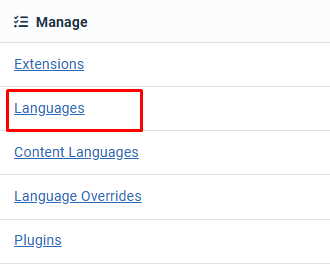 - Menu ke menu System > Manage > Languages, untuk memastikan Bahasa Indonesia sudah tersedia.