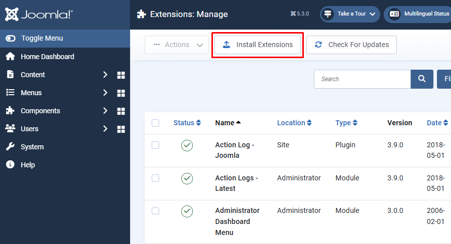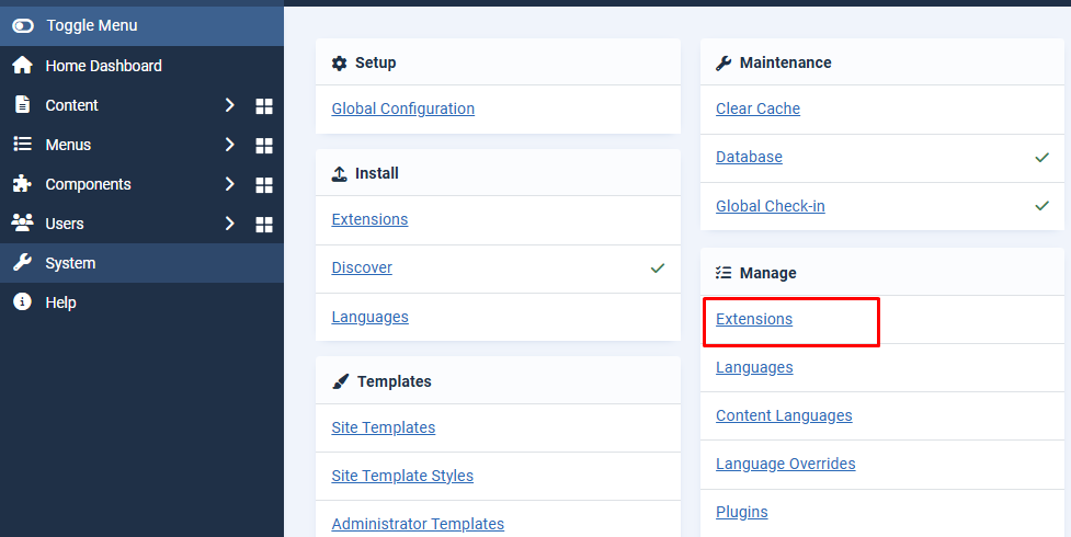 - Selanjutnya kembali ke halaman System > Manage > Extensions.