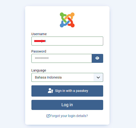 - Silakan login ke halaman administrator Joomla. Defaultnya, Anda bisa mengetikkan namadomain/administrator untuk login ke halaman admin.