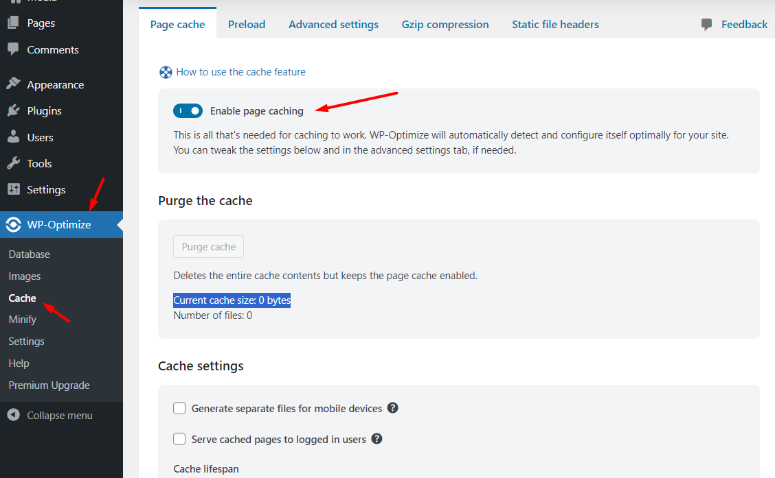 Fitur Cache, jika Anda tidak menggunakan plugin cache lain maka Anda bisa mencoba fitur cache pada WP-Optimize.
