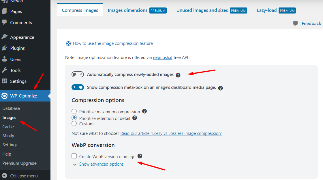 Fitur “Images” pada WP-Optimize bisa digunakan untuk melakukan optimasi pada images atau gambar. Pada versi free, tersedia fitur untuk mengkonversi gambar JPG dan PNG ke format WebP.