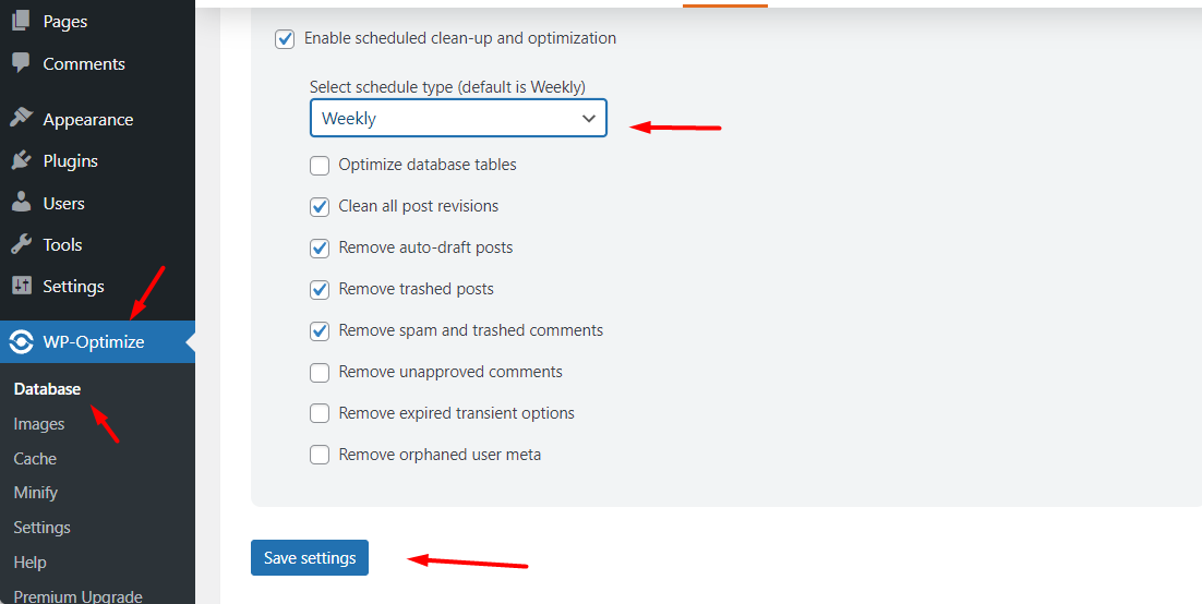 Klik WP-Optimize. Kemudian klik Database, setelah itu masuk menu Settings. Atur Scheduled clean-up settings misalkan untuk 1 minggu sekali kemudian klik “Save Settings”.