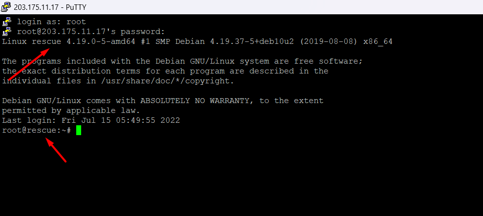 Setelah rescue mode aktif, Anda bisa melakukan koneksi melalui VNC atau SSH menggunakan root password rescue mode yang sudah dibuat. Di bawah ini adalah tampilan SSH ke VPS dengan mode rescue.
