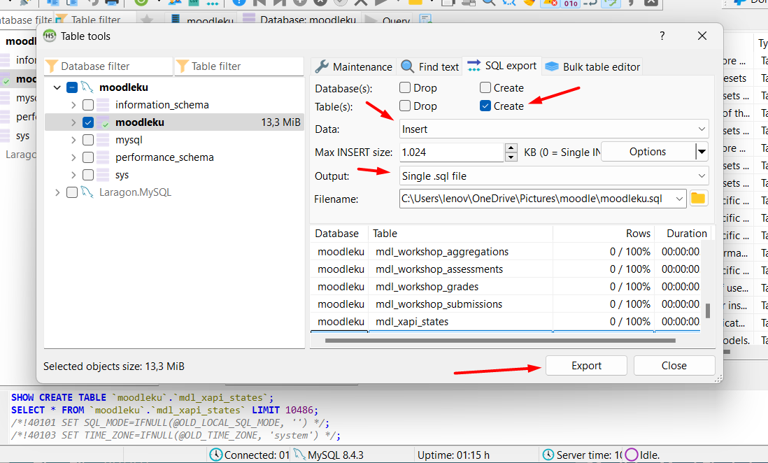 - Pilih database moodle Anda > klik kanan > pilih opsi Export database as SQL.