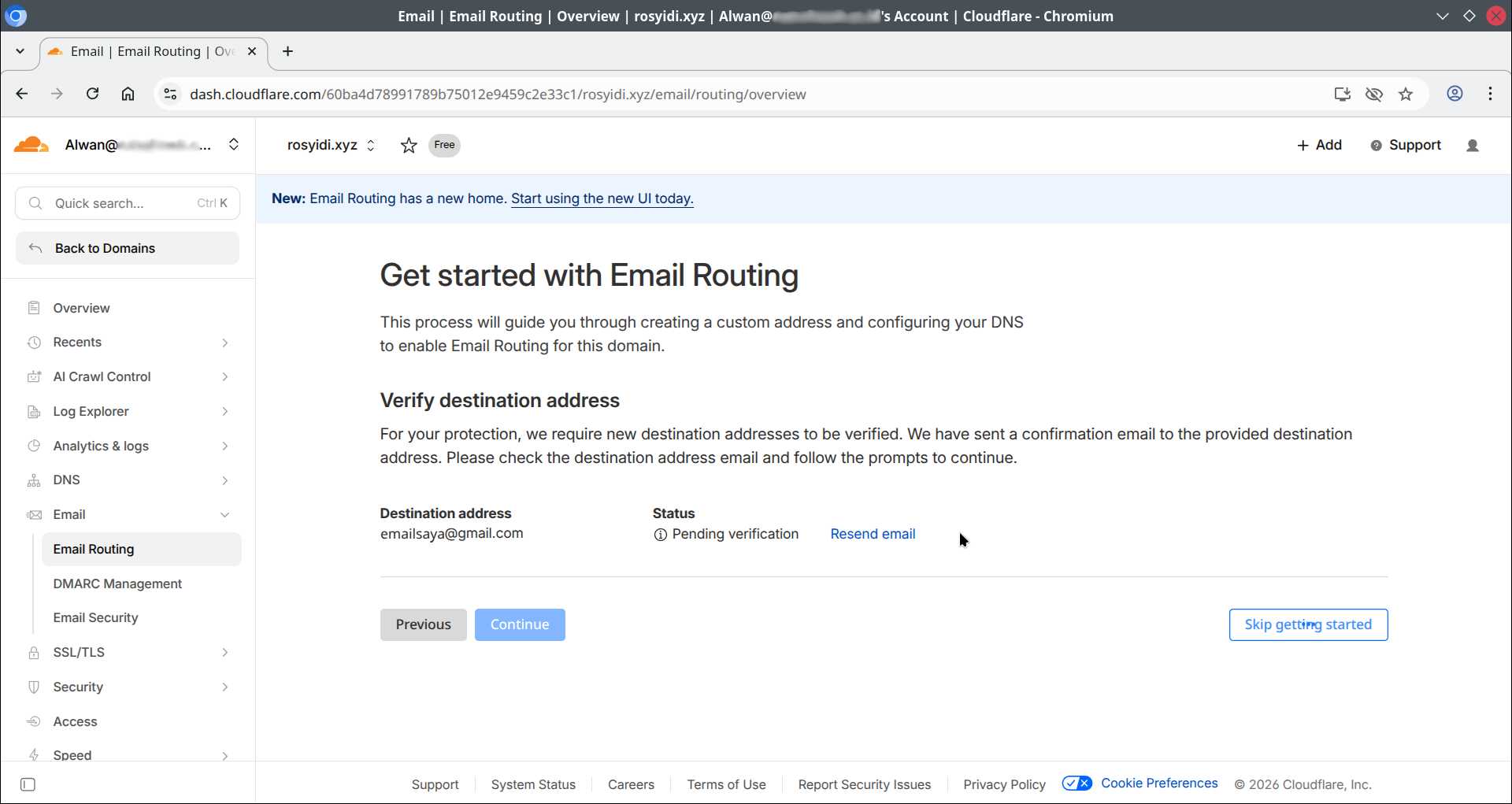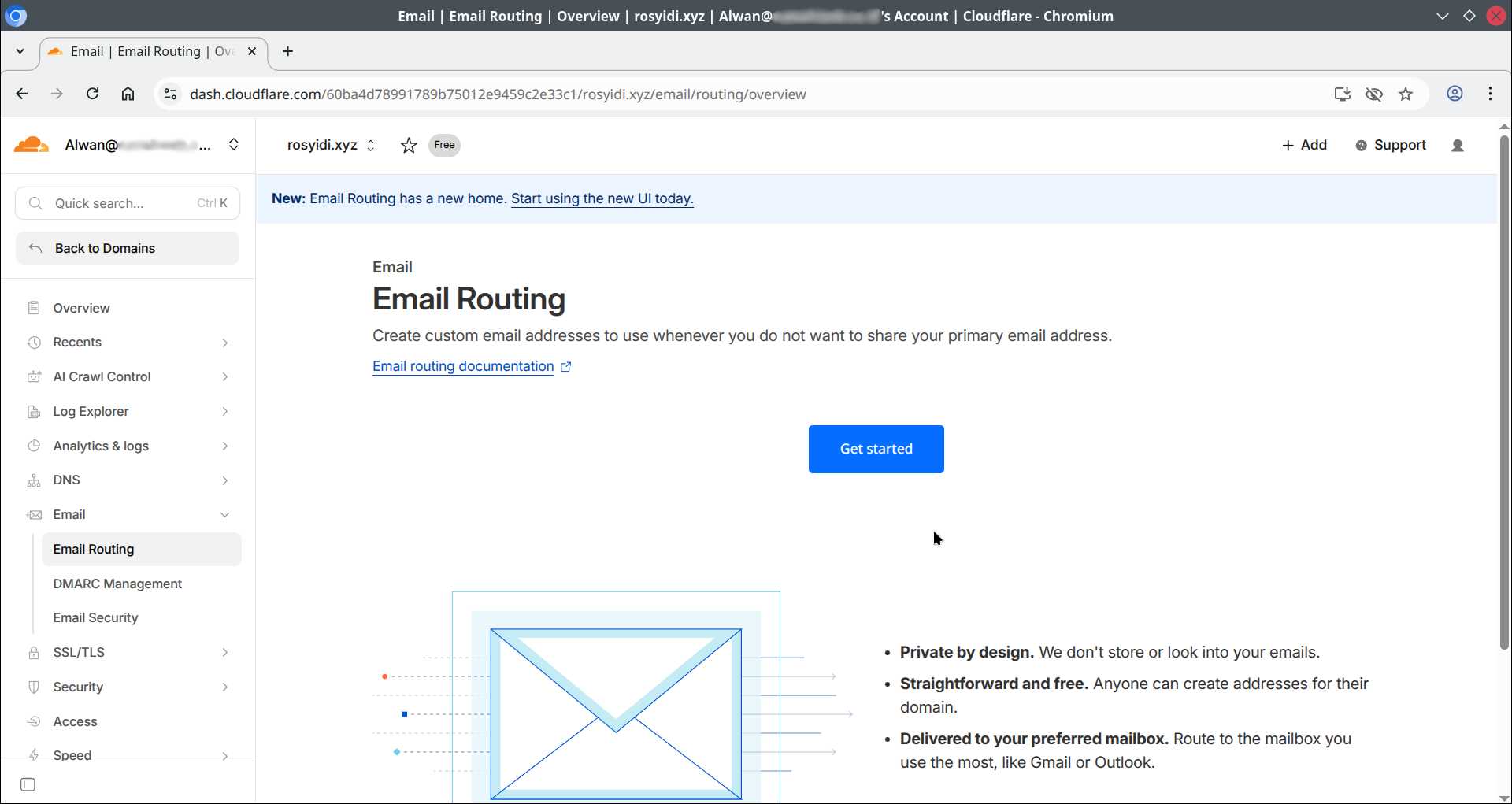 Setelah domain berhasil dihubungkan ke Cloudflare, silakan login ke akun Cloudflare yang digunakan, kemudian masuk ke menu Email -> Email Routing, klik Get Started.