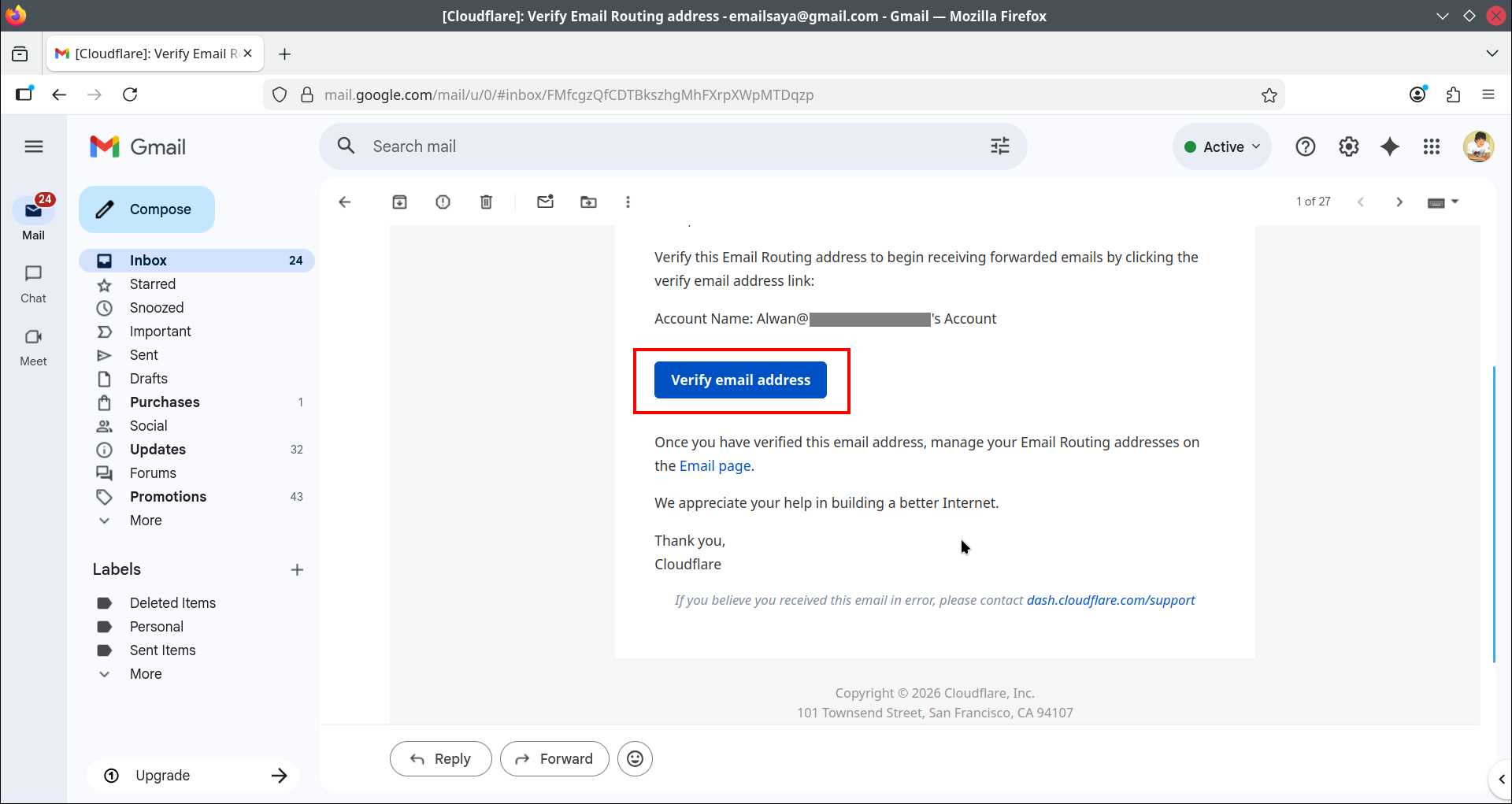 Cek inbox gmail yang Anda gunakan. Anda akan menerima email dari Cloudflare, dengan judul “Verify email routing address“.