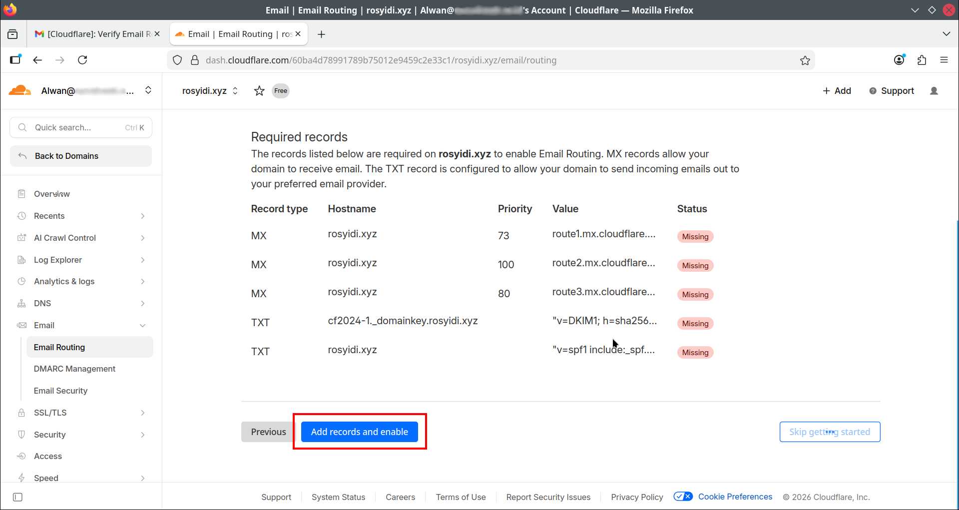 Kembali ke dashboard akun Cloudflare milik Anda, kemudian masuk ke menu Email -> Email Routing. Kali ini akan muncul halaman konfirmasi untuk mengaktifkan DNS routing. Klik tombol Add records and enable.