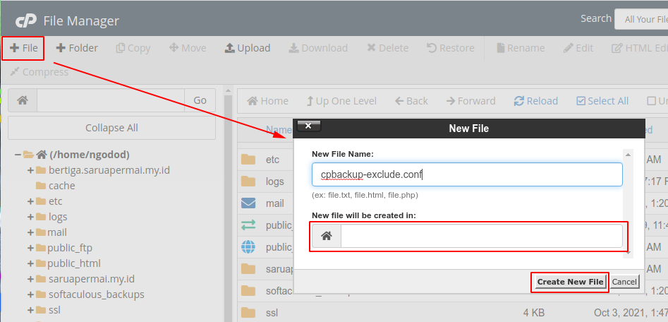 3. Pada folder home, klik tombol “+ File”, buat file baru dengan nama “cpbackup-exclude.conf”. Klik “Create New File” untuk menyimpan.