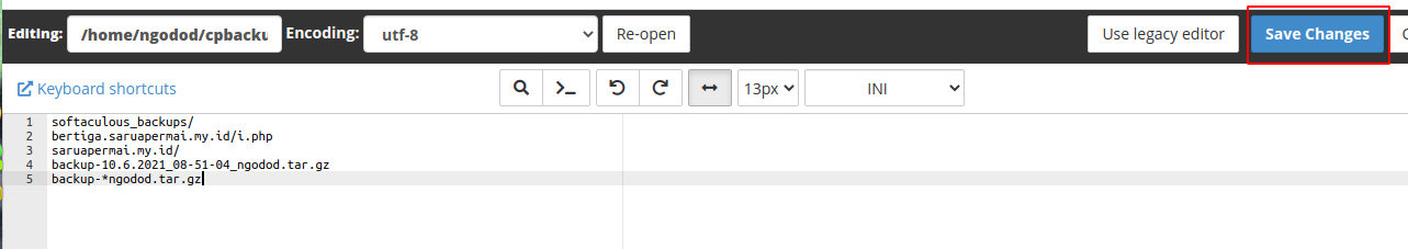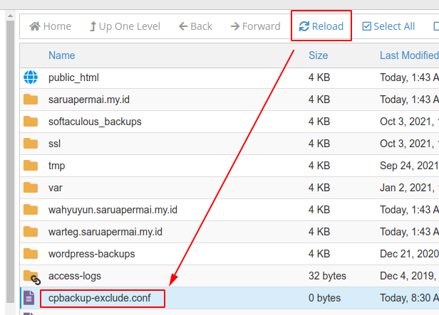 4. Klik tombol “Reload”, pastikan file cpbackup-exclude.conf sudah tampil.