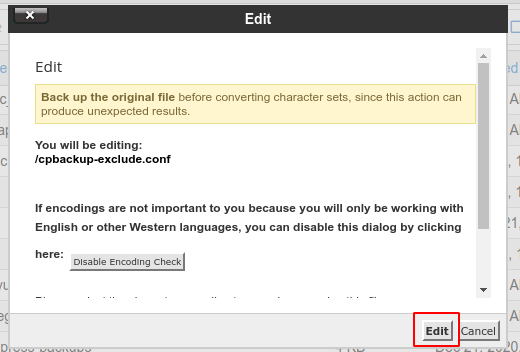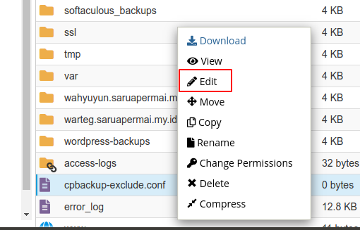 5. Klik kanan pada file cpbackup-exclude.conf, kemudian klik menu “Edit”.