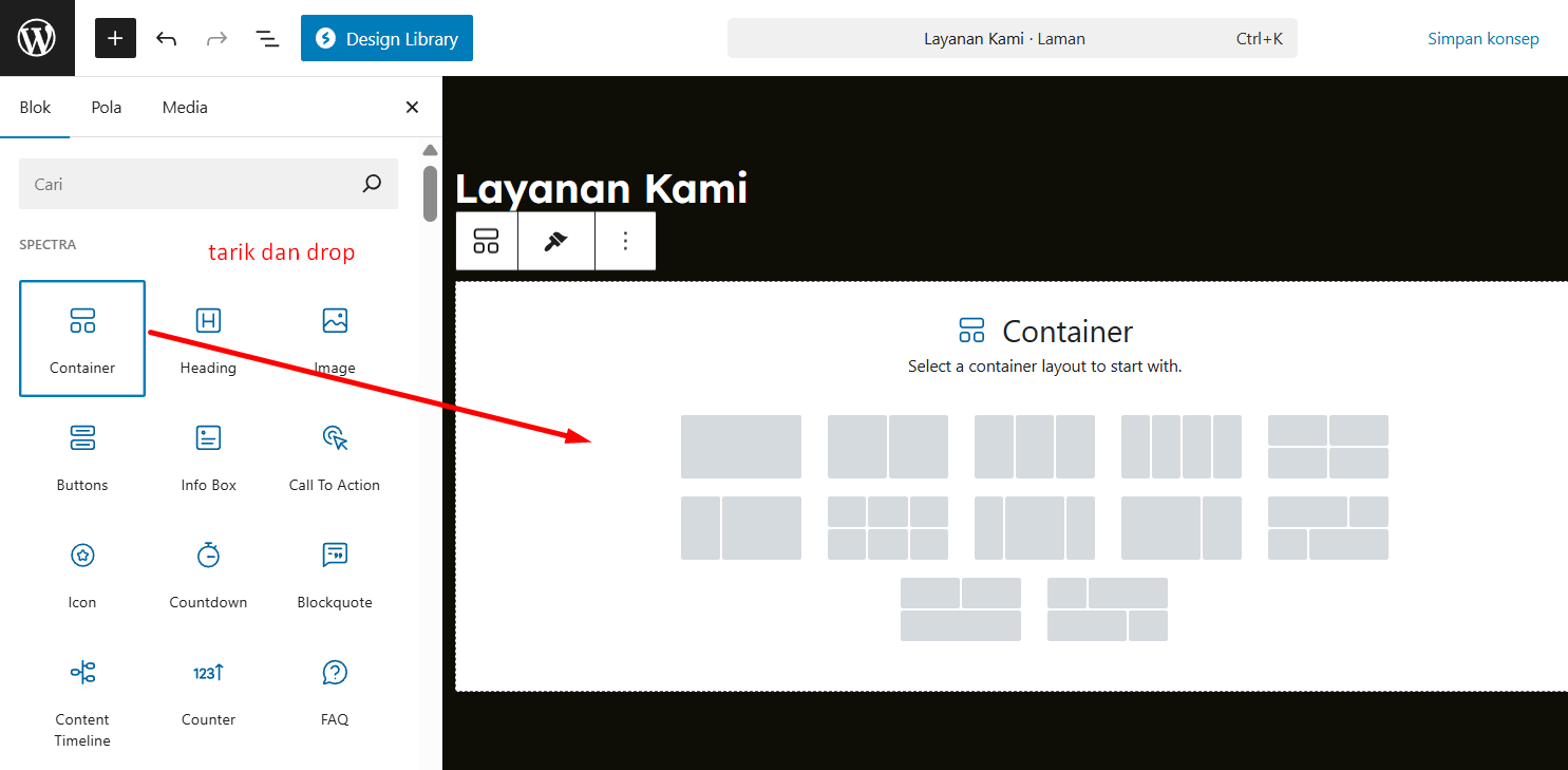 - Lalu pada kolom Blok, Anda bisa menambahkan konten sesuai kebutuhan dengan menggunakan WordPress Block Editor.