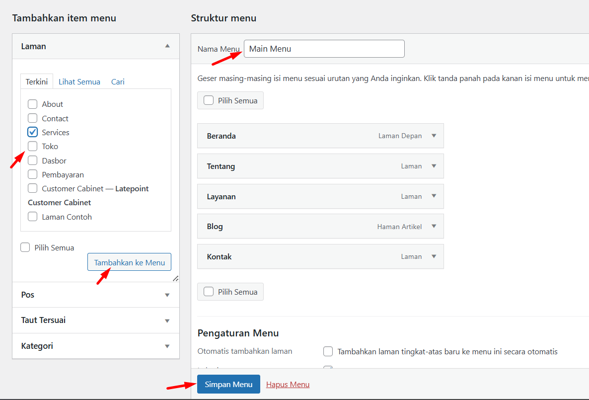 - Selain Laman, Anda juga bisa menambahkan post, category atau custom link sebagai menu.