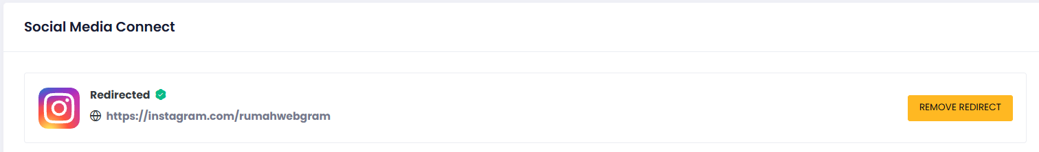 - Sampai tahap ini, setting redirect ke akun instagram telah selesai. Apabila ingin di hapus atau di ganti ke URL sosmed lainnya ada cukup klik “remove connect”.