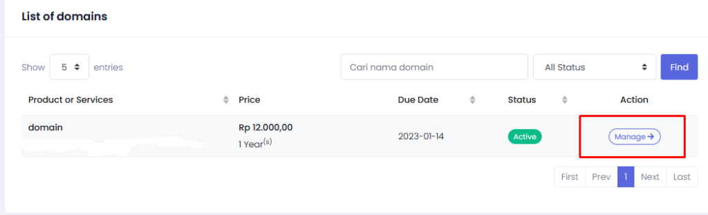 2. Klik tombol “Manage” yang ada di sebelah kanan tulisan Active pada nama domain yang dimaksud.