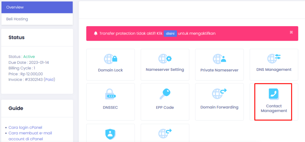 4. Silahkan klik Registrant untuk mengubah data email yang sesuai, kemudian klik tombol “Manage Domain Contact“