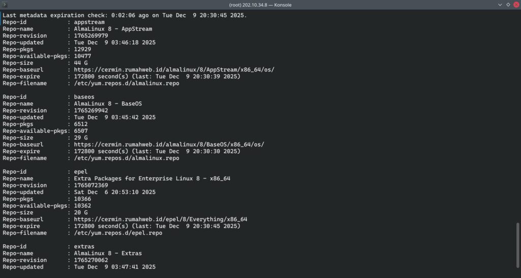 Untuk mengecek status repository Almalinux yang sudah Anda buat sebelumnya, Anda bisa menjalankan perintah berikut: